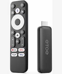 ETOE T2 Certified Google Android Smart TV Stick - Google TV, 1080p60 AV1, 4K, Voice Control, Chromecast Built-in cast, Compatible with Netflix, YouTube, Amazon Prime Video, Disney+ and more, Dual-Band Wi-Fi 2.4G/5G, Bluetooth 5.0 Connectivity, Amlogic S805X2, Quad-core ARM Cortex-A35 (64-bit, up to 15K DMIPS) CPU, 1.5GB LPDDR4 Memory, 8GB eMMC Storage, Up to 1080p at 60fps Resolution, HDR10, HLG, HDR10+, HDMI 2.0 with HDCP, Android 12 Operating System, 1 Year Warranty.